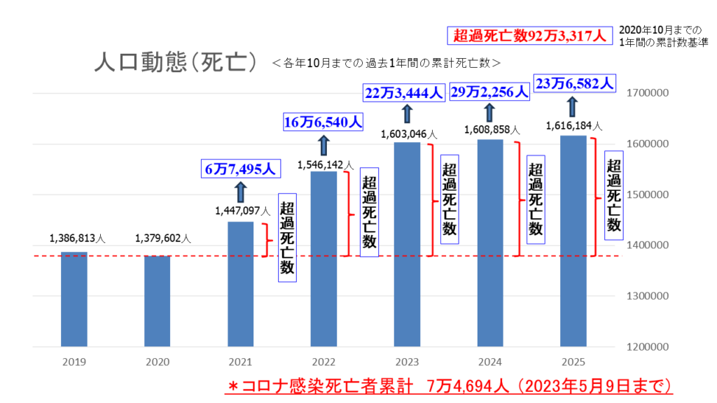 2025年12月21日現在、WHOは全世界で感染者7億7,903万4,940人、死者710万7,666人 (致死率0.912%)と発表しています。現在は終息に向かっていますが、コロナウイルスによる死者(2023年5月9日まで国内で7万4,694人<厚生労働省>)よりもコロナワクチン(薬害)による死者(2019年以降の5年間の超過死亡数92万3,317人)のほうがはるかに多いと指摘する学者や医療関係者も多い。