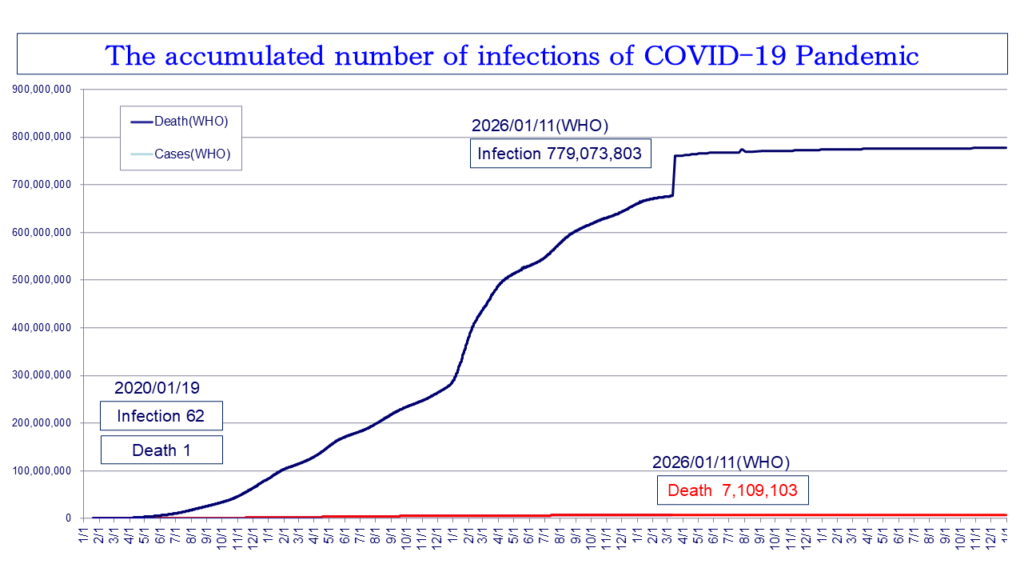 2024年1月11日現在、WHOは全世界で感染者7億7,907万3,803人、死者710万9,103人 (致死率0.912%)と発表しています。現在は終息に向かっていますが、コロナウイルスによる死者(2023年5月9日まで国内で7万4,694人<厚生労働省>)よりもコロナワクチン(薬害)による死者(2019年以降の5年間の超過死亡数94万4,495人)のほうがはるかに多いと指摘する学者や医療関係者も多い。