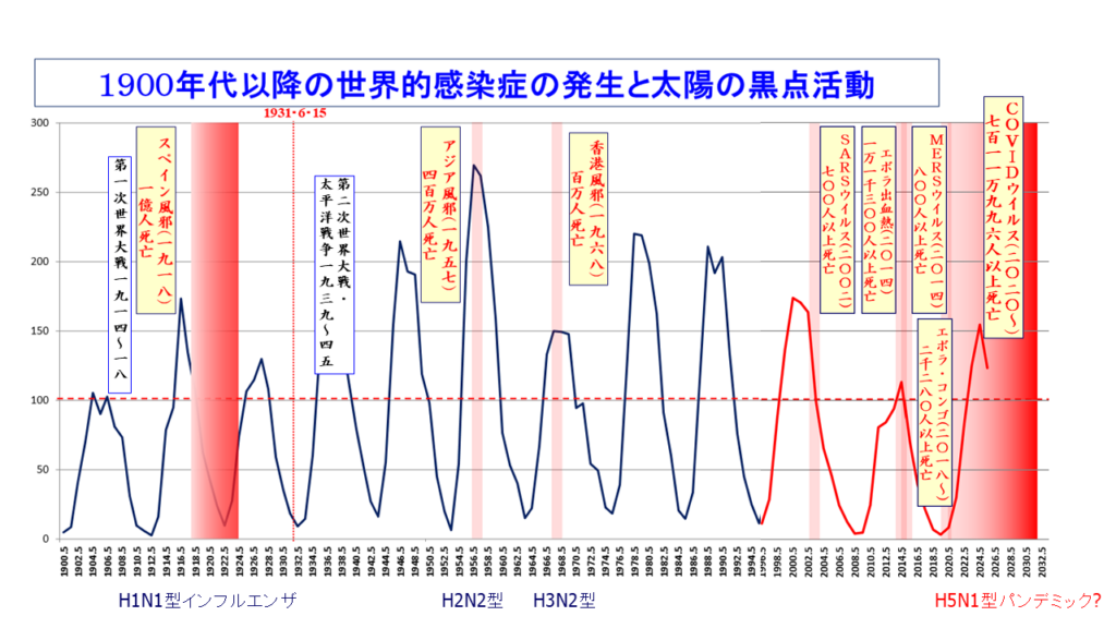 同年2019年、新しい太陽黒点活動(第25周期)の始まった12月、中国・武漢から端を発した新型コロナウイルス<COVID-2019>は瞬く間に全世界に広がり、最初の死者が確認された2020年1月19日からわずか20日余りで、SARSによる2年間の死者数を大幅に超え、3月12日WHO(世界保健機関)は遂にパンデミックの宣言をしました。