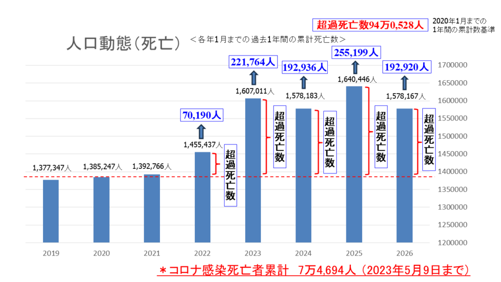 2026年3月8日現在、WHOは全世界で感染者7億7,917万4,317人、死者711万2,927人 (致死率0.913%)と発表している。現在は終息に向かっているが、コロナウイルスによる死者(2023年5月9日まで国内で7万4,694人<厚生労働省>)よりもコロナワクチン(薬害)による死者(2019年以降の5年間の超過死亡数94万0,528人)のほうがはるかに多いと指摘する学者や医療関係者も多い。