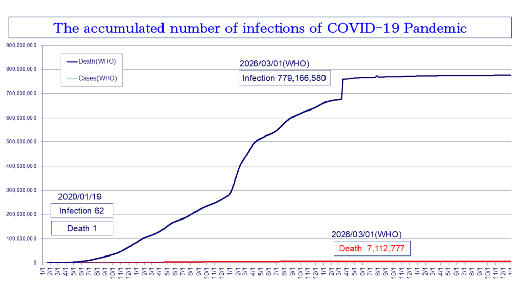 2026年3月1日現在、WHOは全世界で感染者7億7,916万6,580人、死者711万2,777人 (致死率0.913%)と発表している。現在は終息に向かっているが、コロナウイルスによる死者(2023年5月9日まで国内で7万4,694人<厚生労働省>)よりもコロナワクチン(薬害)による死者(2019年以降の5年間の超過死亡数92万6,443人)のほうがはるかに多いと指摘する学者や医療関係者も多い。