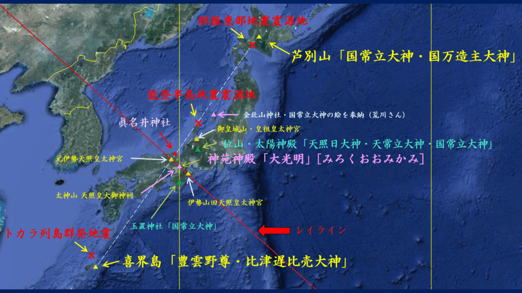 そして迎えた2024年(令和6年)の元旦午後4時10分、眞名井神社と北海道の芦別山との直線上に位置する能登半島でM7.6の大地震が発生し475人が死亡した。さらに9月21日には能登半島豪雨により15人が死亡した。
