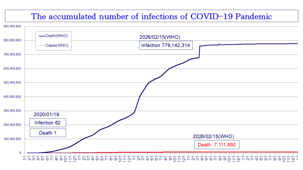 2026年2月15日現在、WHOは全世界で感染者7億7,914万2,314人、死者711万1,892人 (致死率0.913%)と発表している。現在は終息に向かっているが、コロナウイルスによる死者(2023年5月9日まで国内で7万4,694人<厚生労働省>)よりもコロナワクチン(薬害)による死者(2019年以降の5年間の超過死亡数92万6,443人)のほうがはるかに多いと指摘する学者や医療関係者も多い。